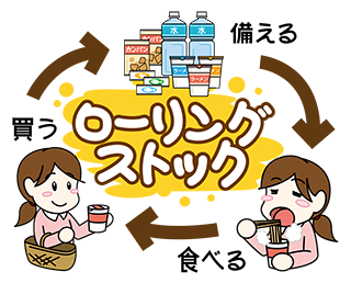災害用の非常食を備蓄するのではなく、日常的に食べている食品を少し多めに買い揃え、食べた分だけ、また新しいものを補充することで備蓄ができることをローリングストックといいます。